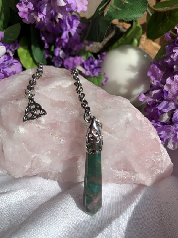 A pendulum is a mass hanging from a point so that the mass can swing free. Simple description is a string or line with a weight at one end, made from a variety of materials including crystals, wood, glass, and metals. Called dowsing you may use it to connect to a higher energy, or to clear your chakras, remove blocked energies, Have questions answered, Heal your body parts and many more uses. Set your intentions, ask it questions to receive guidance, awareness, and understanding.